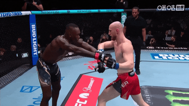 比赛伊始,双方先是在站立层面进行试探。乔·派弗展现出了年轻选手的冲击力,很快近身尝试抱摔,试图利用力量优势放倒阿迪萨亚。然而,阿迪萨亚耐心的挣脱出来,凭借其标志性的距离控制和精准的扫踢,有效遏制了派弗的突进。